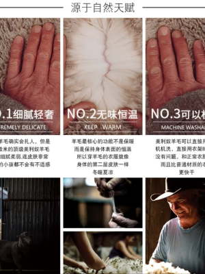 4、羊毛含量:推荐100%丝光羊毛,这样面料触感和天然针织弹力都比较好,可以混有一斤少量尼龙,这种多是尼龙包芯纱工艺。不推荐混有聚酯纤维(涤纶)的,面料触感下降N个档次;也不推荐混有腈纶的,容易起静电和起球。