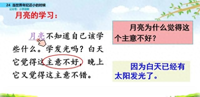 2、月亮不知道自己该学些什么。学发光吗?白天它觉得这主意不好,晚上它又觉得这主意不错。它一直无法决定,只好反反复复,一阵子这样,一阵子那样。