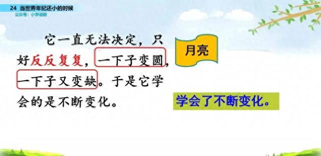 月亮学会的是不断变化。从“白天、晚上、反反复复、一阵子这样、一阵子那样”看出月亮开始想学发光,但是始终拿不定主意,只好变来变去, 最终学会了不断变化。