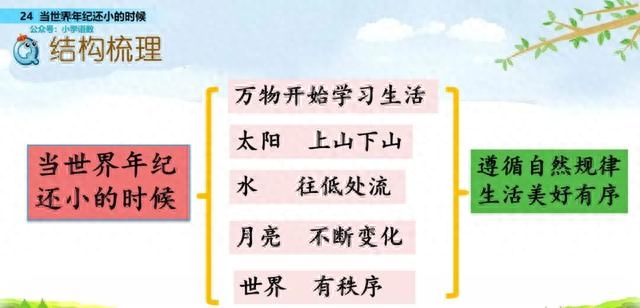 太阳发光,每天东升西落;月亮有时圆,有时缺,不断变化;水一直往低处流。太阳给世界带来了光明和温暖;月亮的圆缺变化帮助人们计量时间;水滋润万物,帮助万物生长。它们都做着自己最容易做的事,让这个世界很有秩序,很美好。