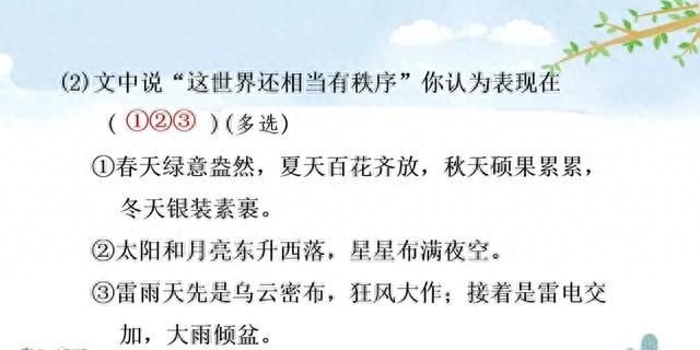 (1)这世界还相当有秩序。每天,太阳都会东升西落,上山下山,发光发热。月亮每天按照自己的想法,变化莫测,有时出现,有时不出现,有时圆,有时缺;水每天都按照自己的方式,往低处流,往低处流,往低处流…… 动物们每天按照自己的生活习惯,快乐地生活着。
