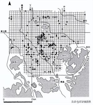 宫城之外为皇城,皇城之外为都城。城内街道呈棋盘形,东西、南北纵横有秩,布局整齐划一,明确划分皇宫、官府、居民区和商业区。