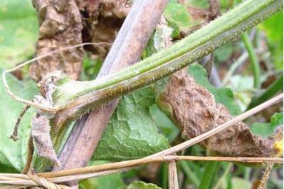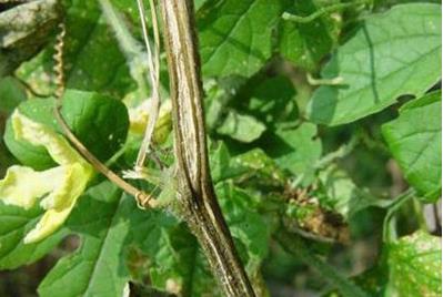 茎蔓染病:主要在茎基和茎节等部位,初始产生油浸状小病斑,逐渐扩大后往往围绕茎蔓半周至一周,纵向可长达几十厘米,病部密生小黑点,后期病斑变成黄褐色。
