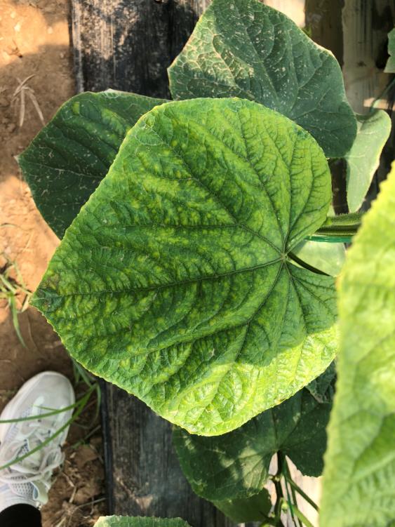 幼苗感病,子叶常变黄枯萎,成株期叶片发病出现黄绿相间或黄白相间的花叶,叶片略皱缩。瓜条发病出现深浅绿色镶嵌的花斑,凹凸不平或为畸形。