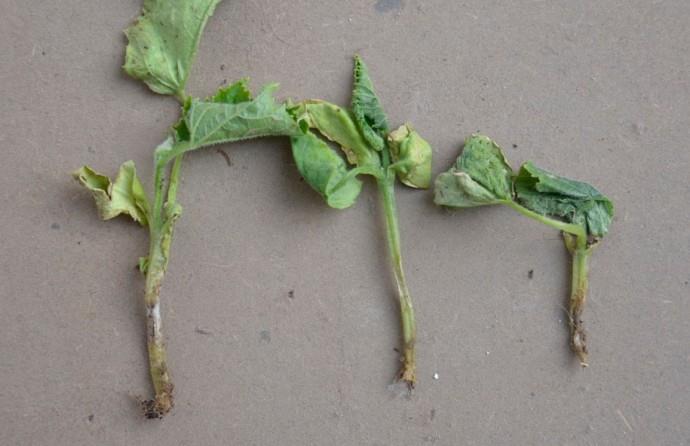 危害症状:一般苗期发病。主要危害茎基部及地下部分,初为椭圆形或不规则暗褐色病斑稍凹陷,病斑扩展后绕茎一圈,幼苗萎蔫,最后干枯死亡。(苗床湿度过大时,病部可见不甚明显的淡褐色蛛丝状霉)