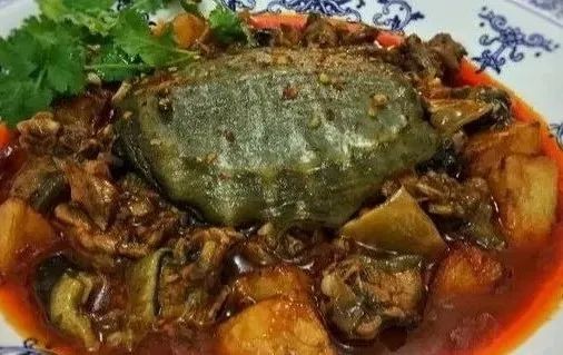 4.锅入熟菜籽油烧热,下生姜、蒜子炸香,下牛蛙、鳝鱼片中火炒匀,待牛蛙肉质缩紧,变成蒜瓣状,倒入调好的红汤,小火煨15分钟,起锅前烹入陈醋即成。