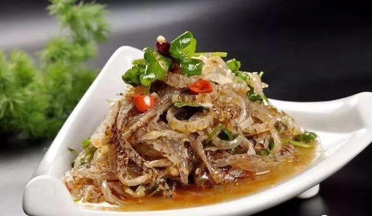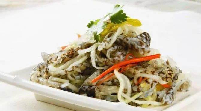1.青鱼皮洗净,放入碱水浸泡后冲水,略烫,放入冰水中冰镇后切丝。
