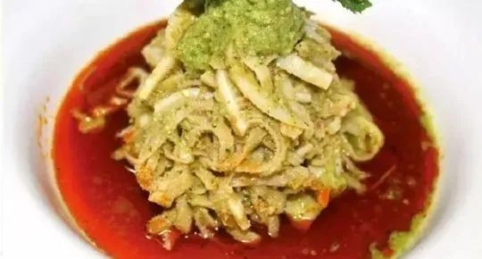 酸辣汁制作:干椒碎、姜末、蒜末,盐,味精,热高汤,黄豆酱油,醋,粗辣椒面,白糖,红油拌匀即可。