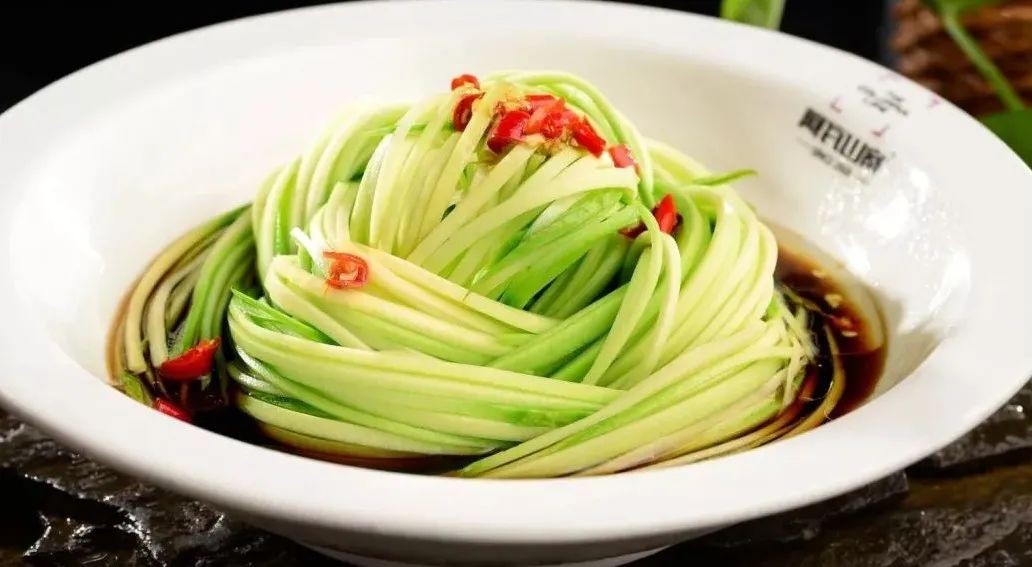 1.将西葫芦洗净后,切成粗0.2厘米,长8厘米的细丝(不要内瓤)。用冰水镇15分钟捞出装盘,撒上搓椒、花椒面。