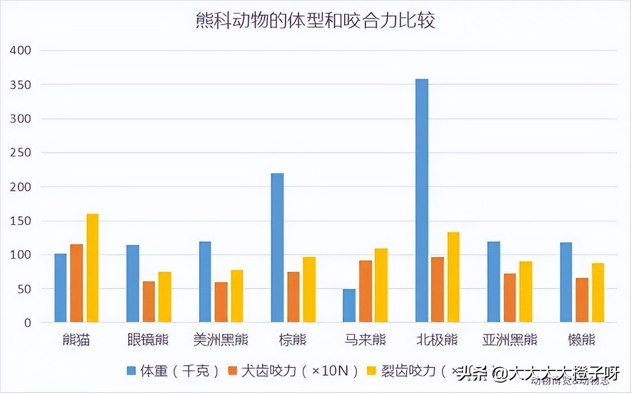 能食铁,那自然是咬合力惊人,我曾在网上看到过一个大熊猫和其他熊类战斗力的对比,贴出来让大家有个更直观的感受!
