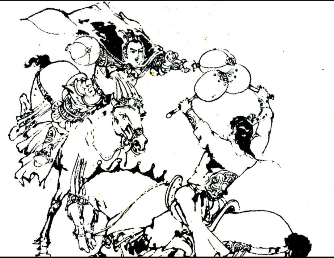薛葵请战,薛葵和李元霸一样有拔山撼岳的本事,力大无穷,使一对擂鼓嗡金锤,有人说薛葵就是李元霸转世,是薛家最猛的一员虎将了,两人交战几十个回合,驴头太子力乏,便使了黑煞飞刀打伤了薛葵(这驴头太子有点不讲武德,说好的物理攻击,结果你玩法师了)。