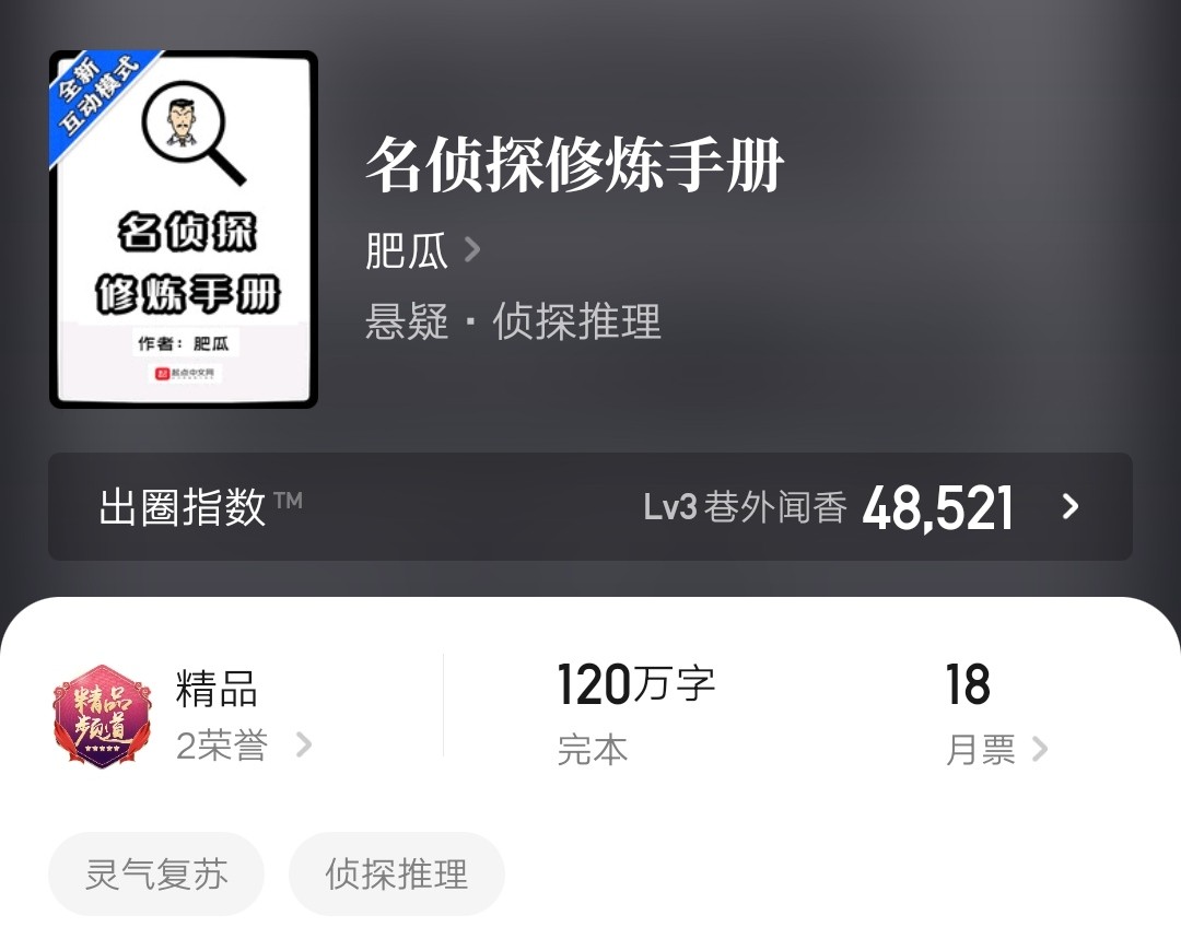 书评:肥瓜作品,脑洞开到天际,是一本和读者实时互动的小说。读者可以参与剧情,可以通过本章说上电视,而且可以看出作者有基本的大纲,无论是否抄书评都可以继续推进剧情,主角穿越成为一个精神病人,并且被卷入了一个杀人案件,主角可以依靠名侦探修炼手册与读者互动,从读者处获得信息来进行推理或采取一些行动。非常不错。