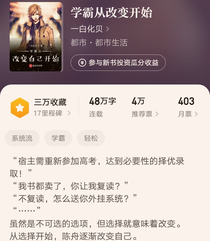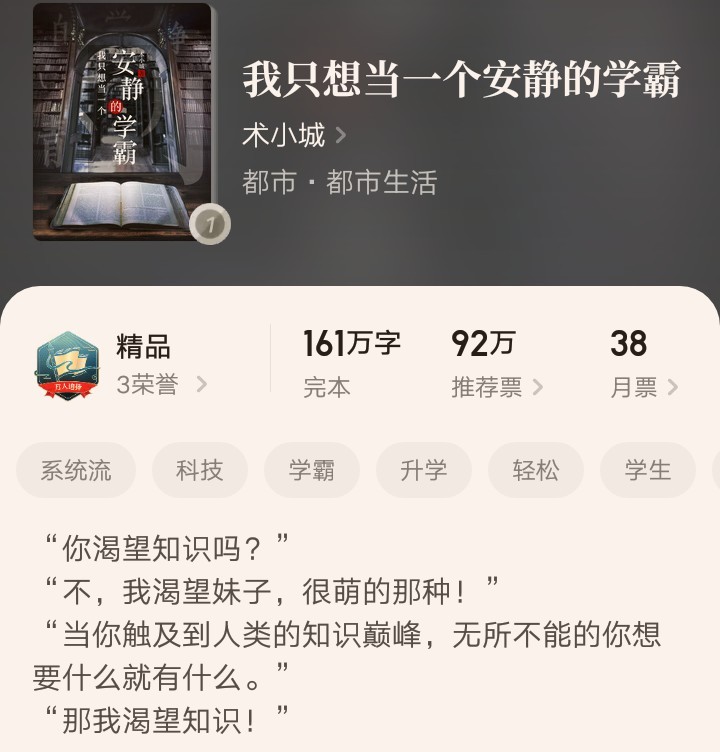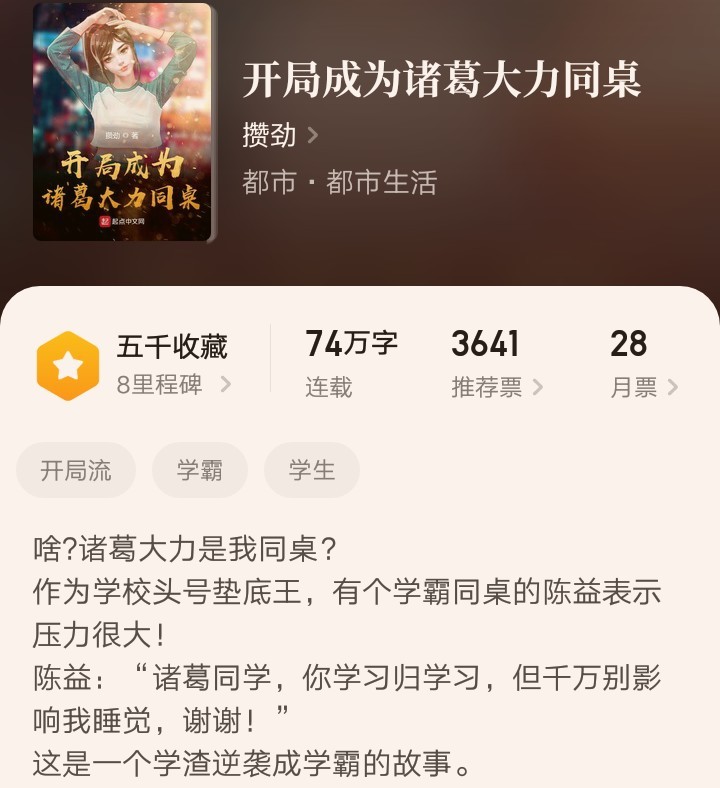 因为特别喜欢爱情公寓,每一季都看过好多遍。特别是对我特别喜欢诸葛大力,这个学霸的角色,简直就是我心里憧憬的我自己。所以这本书的名字,就很轻松的吸引了我的注意。这本书算是一本小幼苗,文笔有些稚嫩,不过剧情丰满,金手指设定我非常喜欢。主角是一个上课睡觉,下课尿尿的全校垫底生,典型学渣钢铁直男。偶然获得系统后,又阴差阳错的和新来的学霸诸葛大力成为同桌,从此他的学霸生涯开始了。全书最大金手指当然是诸葛大力,其次是系统。主角兄妹是在电视剧中扮演诸葛大力的演员陈果,作者脑洞还是蛮大的。一本轻松脱俗的爽文,脑洞新奇。