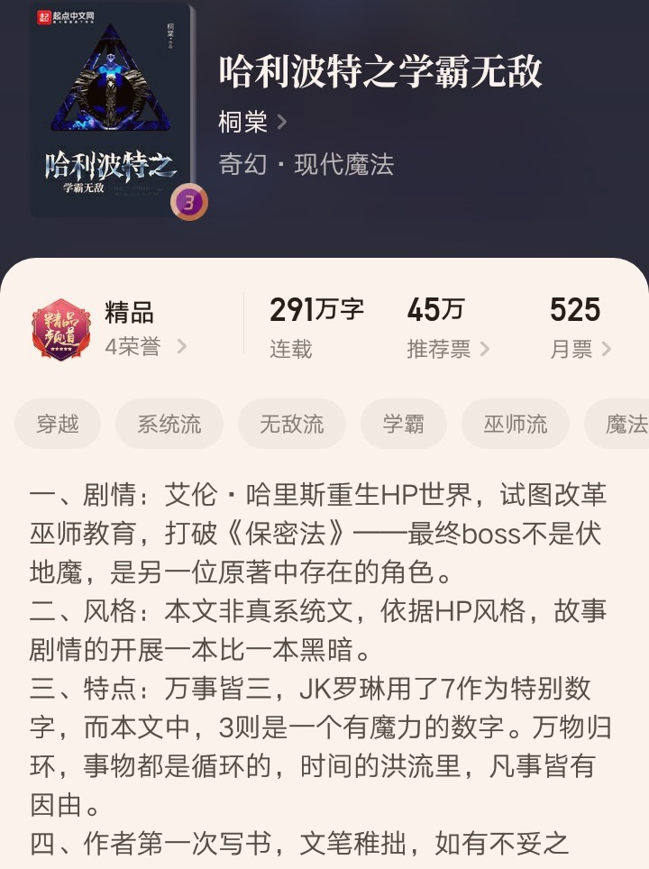 哈利波特同人文,看这种西方奇幻小说,还是令我有点头疼的,因为人物的名字实在太长,难以记住。哈利波特我看的不多,但是这本书真的很不错,一般学霸文都是讲中国教育中学到的一些知识,而这本书讲的是魔法知识,是比较新奇的。主角从现代世界重生穿越到了哈利波特的世界,复生到一个顽皮的成绩一般的小魔法师身上。走无敌流、系统流、巫师流。这本书成绩非常好,作者对待小说也非常认真,前面200多章都是作者后修改优化过的,文笔细腻,画面感强,贴近原著,体感极佳。