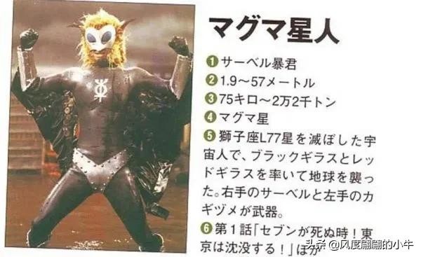 毁灭宇宙众多星球文明的邪恶宇宙人,是率领雷德基拉斯和布莱克基拉斯毁灭雷欧奥特曼的故乡L77星云的元凶,自身战斗实力不强。 在赛文奥特曼与双子怪兽交战中突然出现,变为三对一的情况,还差一点杀死赛文奥特曼,但因雷欧奥特曼的出现和赛文奥特曼的反击而赶紧撤退(但用长刀发出的光线击中赛文并让孪生怪兽基拉斯兄弟逃跑,也有赛文奥特曼因马格马星人的光线攻击无法变身的说法)。