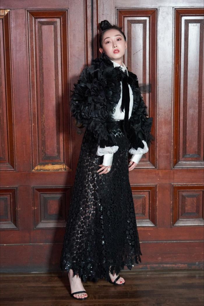 一身黑色羽毛参加时装周专场的蒋梦婕,酷女孩气质凸显。