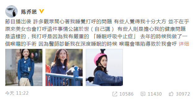 新浪娱乐消息,1月6日,陈乔恩发文回应打呼的问题,她称节目播岀后,许多观众关心她睡觉打呼,关心她的健康,陈乔恩说:“我打呼是因为我有严重的睡眠呼吸中止症。”