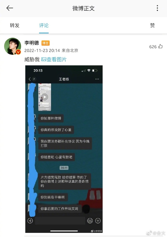 演员李明德发文称被拖欠工资 晒出与老板的聊天记录