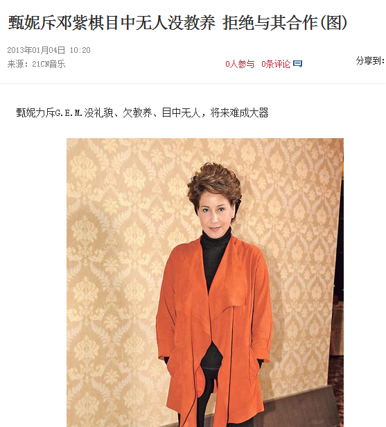 不久后,邓紫棋参加某慈善活动,迎面碰到老前辈珍妮,不但不打招呼,还态度傲慢,被甄妮diss“不懂礼貌、没教养”。