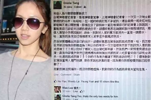 邓紫棋曾在外网账号吐槽:以前和我在一起时,遮遮掩掩,死活不承认;现在却总是在各种场合说说说,好意思吗?重点是,从来没和我提过分手,一个人早已经在外面风流快活。