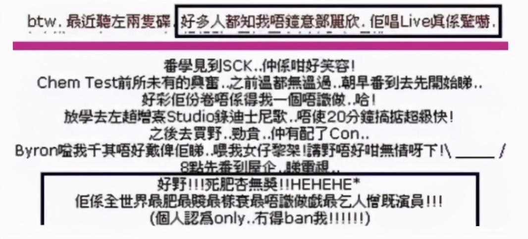 林峰和吴卓羲恋爱那阵子,她还吐槽“林峰和吴卓羲好恶心”;吐槽邓丽欣唱歌超惊吓,一点都不喜欢她等等。