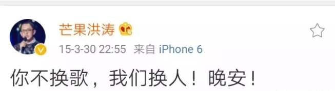 湖南的总导演洪涛气到原地爆炸,马上发微博:“你不换歌,我们就换人!”