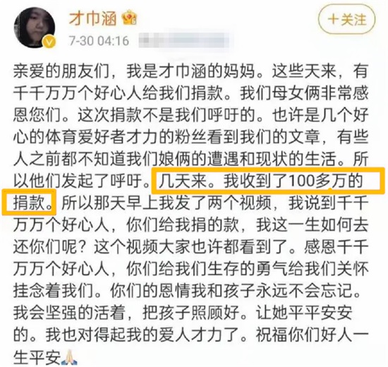 在短短的几天时间内,才巾涵就收到了来自社会各界人士的高达100多万的善款,解了她们母女二人的燃眉之急。