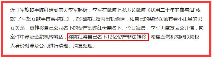 2015年,李军不但彻底揭露了陈红的一切,还声称陈红将名下12亿资产非法转移,更是一纸诉讼将其告上法庭。