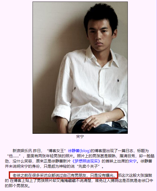 2006年,徐静蕾在自己博客的一篇日记里贴了两张年轻男子的照片,尽管照片中的主人公足够低调,但还是有人认出了这名男子就是宋宁。