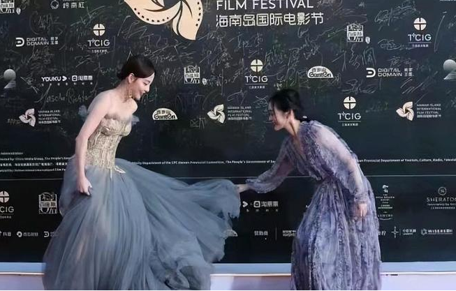 因为她的裙摆比较大,何泓姗主动弯腰去帮她铺开裙摆。