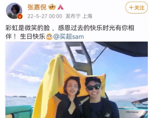 5月份的时候买超过生日,张嘉倪发文“感恩过去的快乐时光有你相伴,生日快乐。”