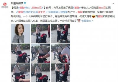 - 董璇游迪士尼,一个人推着婴儿车打着伞,身边并没有助理跟随