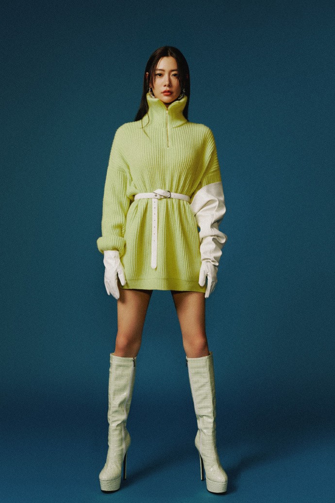 克拉拉Clara用一件针织衫打造下半身失踪的时尚,又A又飒,女人味爆棚!长筒靴夸张的细高跟跟防水台的设计,分分钟气场全开,高挑又气质。