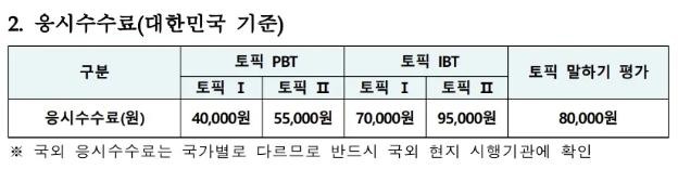 PBT笔考初级40,000韩元,中高级55,000韩元,IBT机考初级70,000韩元,中高级95,000韩元,口语80,000韩元。