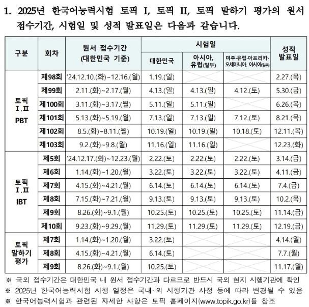 10月10日,韩国教育部官方发布公告《关于 2025 年韩国语能力考试话题 I、话题 II 和话题口语评估实施计划的公告》,其中公布了2025年韩语能力考试(TOPIK)的考试日程: