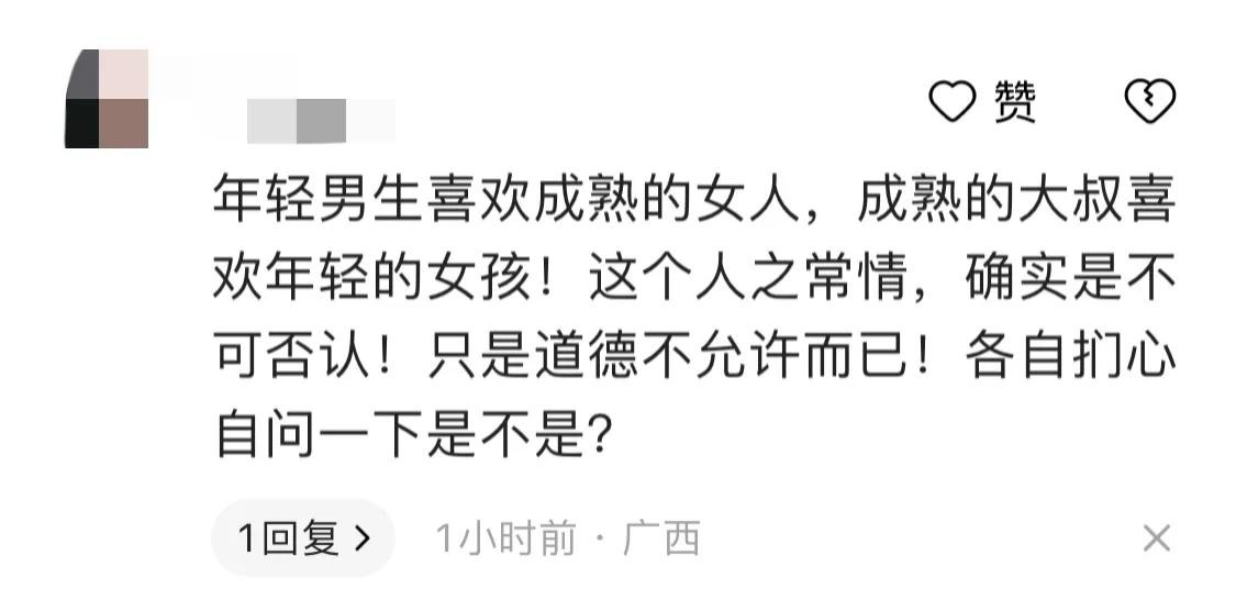 年轻男生喜欢成熟的女人,成熟的大叔喜欢年轻的女孩,这个人之常情,确实是不可否认,只是道德不允许而已,各自扪心自问一下是不是?