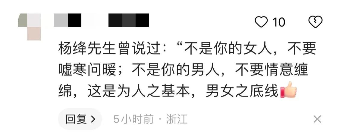 杨绛先生曾说过:“不是你的女人,不要嘘寒问暖,不是你的男人,不要情意缠绵,这是为人之基本,男女之底线。”