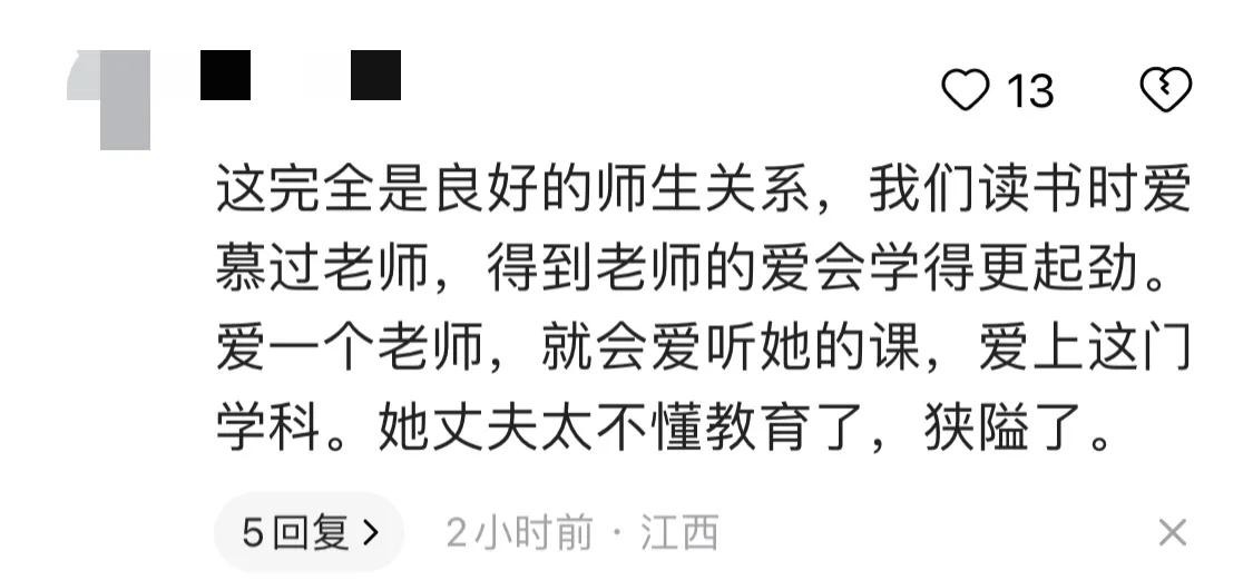 这完全是良好的师生关系,我们读书时爱慕过老师,得到老师的爱会学得更起劲。爱一个老师,就会爱听她的课,爱上这门学科,她丈夫太不懂教育了,狭隘了。