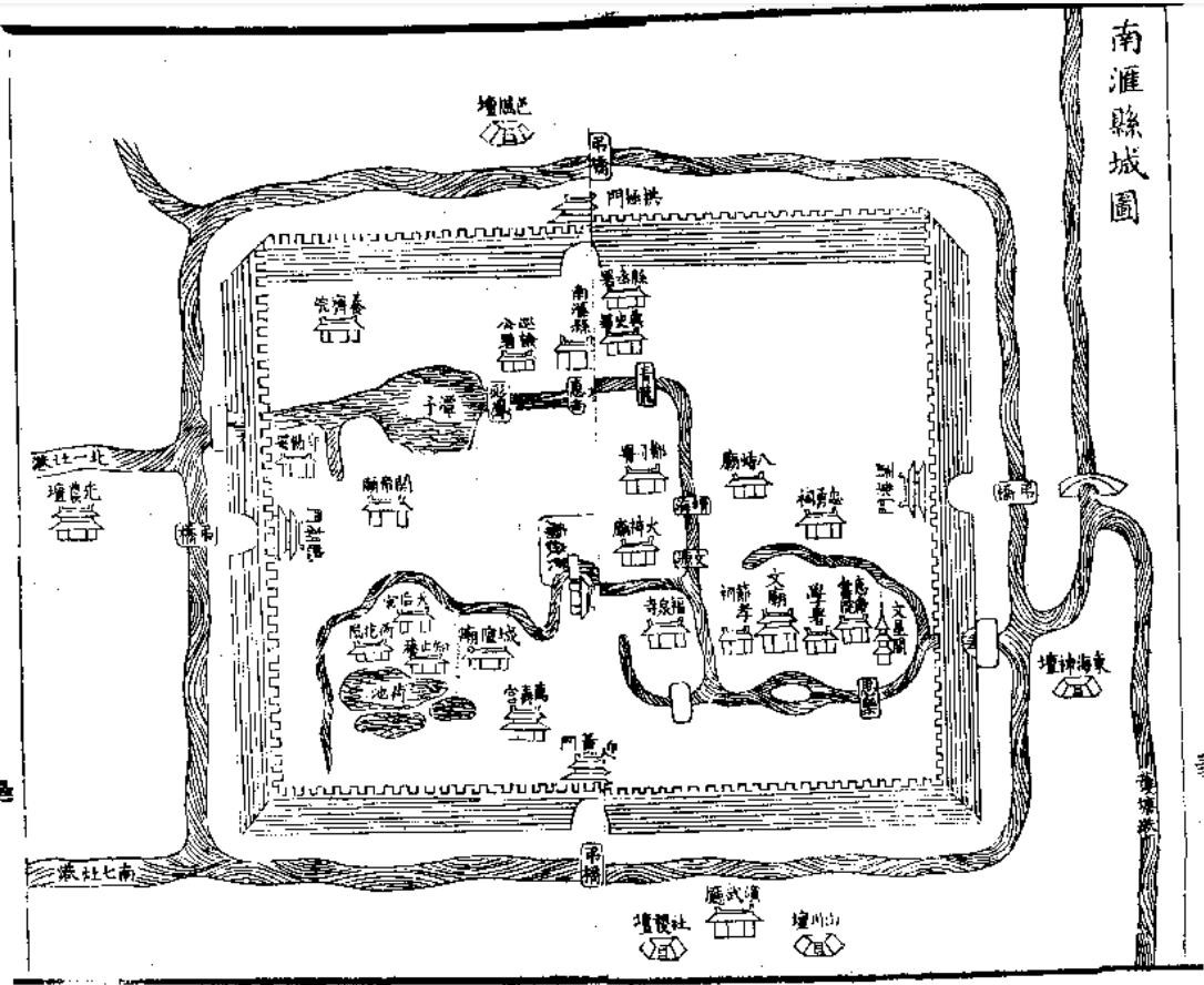 南汇所城周五里一百四十九步,高二丈二尺。设陆城门四座:南门迎熏、北门拱极、东门望(观)海、西门听潮。水关两座:东水关静(靖)海、西水关通济(海)。门楼角楼敌台各四座。