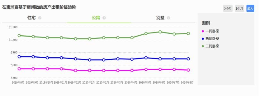 在住房租赁价格方面,从2019年8月至今,过去一年的时间里柬埔寨的公寓产品租赁价格趋于平稳,三居室户型的租金则在今年4月后有所上涨,目前仍低于1500美金/月。而二居室的租金价格约为750美金/月,二居室则在500美金/月左右。