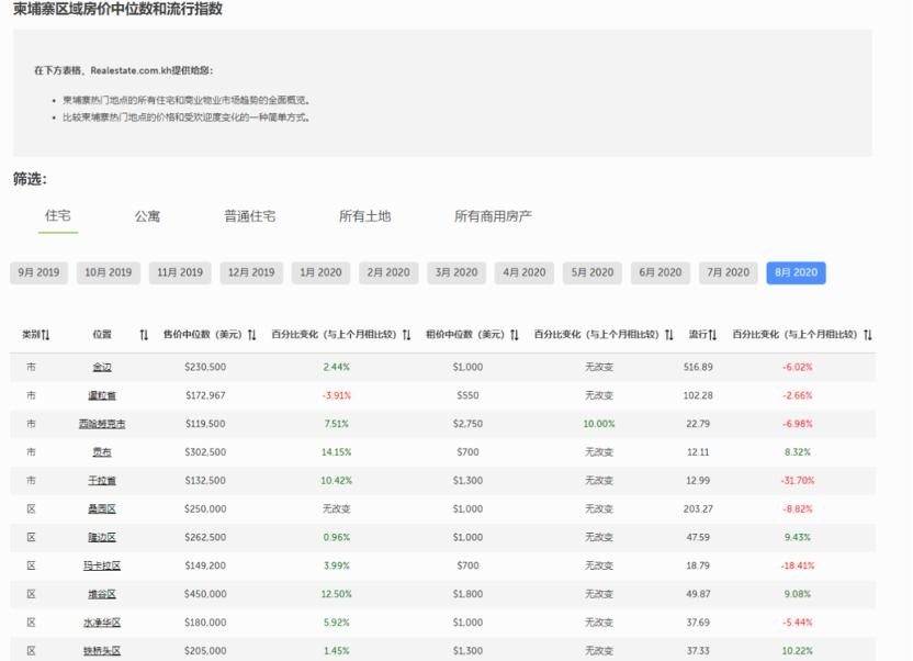 我们整理了柬埔寨热门地点的所有住宅和商业物业市场趋势的全面概览,供投资者参考。趋势图内包含各类住宅产品和商业房产的售价中位数,与上月对比的价格变化,租金中位数等等,为了让您的投资更加明智方便。