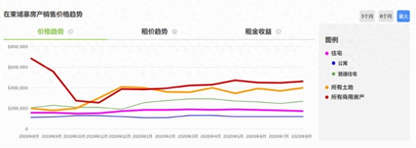 柬埔寨在售物业价格趋势图从价格趋势、租价趋势、租金收益三项数据的发展趋势展开,通过该趋势图,用户可以清晰地看到住宅、公寓、土地、商用房产等不同类型的项目每月的价格变化,并以此了解过去一定时间内价格的波动情况,对未来的发展趋势做出预测。