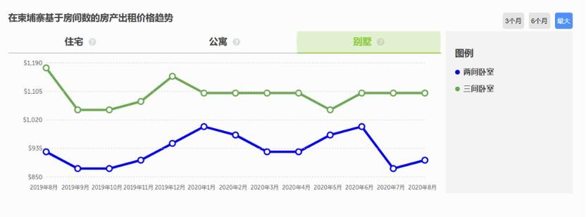相比公寓,别墅的市场租赁价格呈现波动较大。在2019年8月网赌禁令颁布后,二居室的别墅租金均价由925美金/月下降至了875美金/月,三居室的别墅租金均价由1175美金/月下降至了1050美金/月,幅度较大。