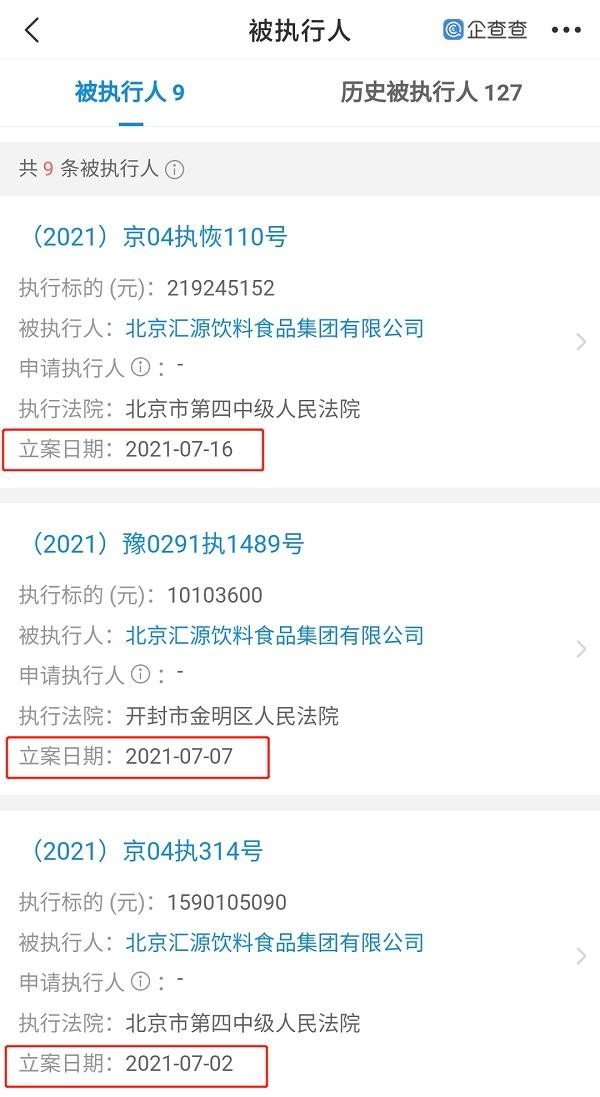 根据被执行人信息显示,7月汇源已被强制执行3次,执行总标的超18亿元,目前被执行总金额约为25.47亿元。要知道,汇源果汁自2007年至2017年,10年净利润总共15.29亿元,还不够还债。除此之外,汇源食品近期被各类案件缠身。案由多为票据追索权纠纷、金融借款合同纠纷、企业借贷纠纷等。如果没有人愿意接手,这个经历了29年风风雨雨的国民品牌,就要彻底消失在人们的视线中了。