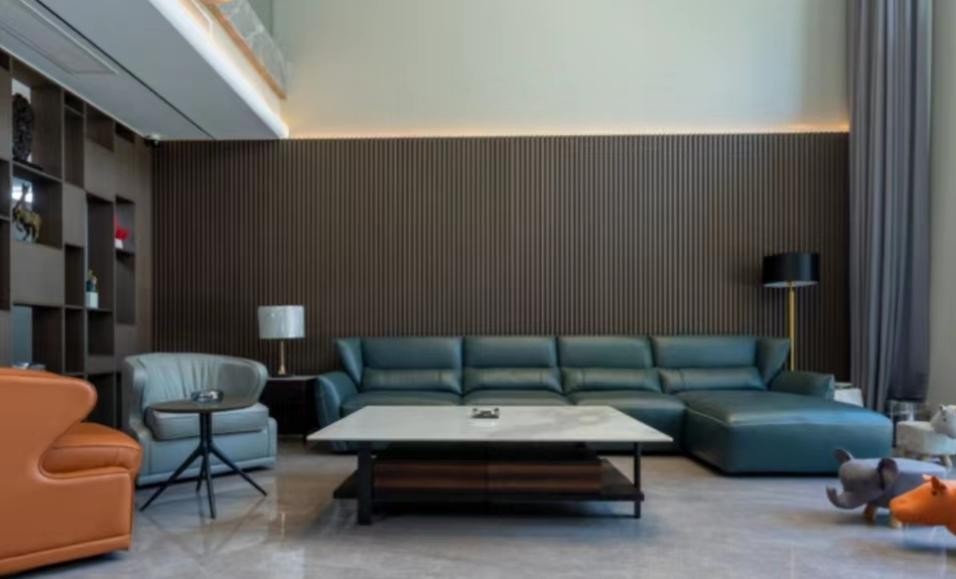 地面的灰色搭配墙面的木色,两种颜色相辅相成的同时,从落地窗透过的阳光,给空间带来了温暖纯净的格调。