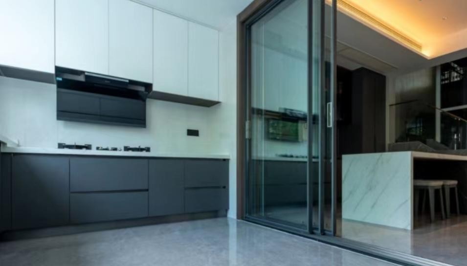 厨房整体以简约为主,褐色橱柜和白色的吊柜相对应,有效区隔了视觉空间,墙面则采用简一卡拉拉白大理石瓷砖,经典的白色基底上浅灰纹理自然流淌,打造时尚雅致的氛围,烹饪也变得高级起来。