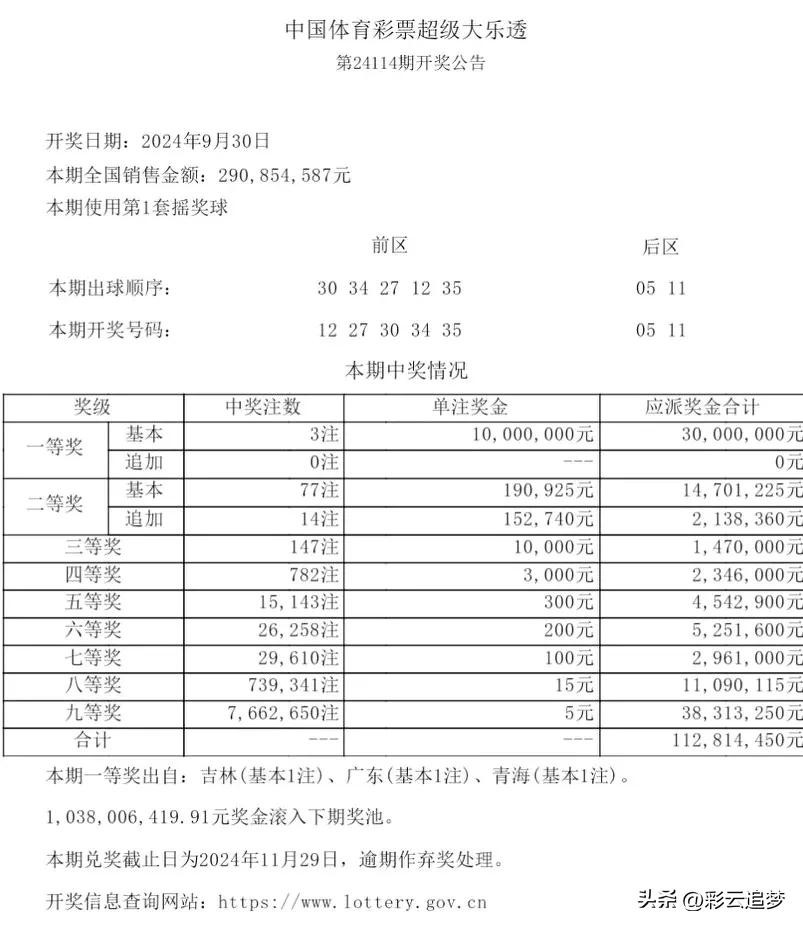亲爱的家人们,晚上好!在这金秋九月的尾声,我们迎来了中国体育彩票超级大乐透第24114期的激动人心时刻。在两位公正的公证员全程监督下,本期大乐透的中奖号码终于揭晓:12,27,30,34,35与后区的05,11。前区号码中,34与35紧紧相连,仿佛预示着幸运的延续;奇偶比2:3,三区比1:0:4,二区遗憾断档,跨度达23,后区则呈现出一大一小双奇的独特组合。这样的号码分布,无疑给技术型彩民带来了挑战与机遇并存的刺激体验。