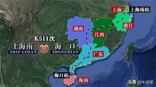 K511次列车运行线路图:上海南开往海南海口,全程2540公里