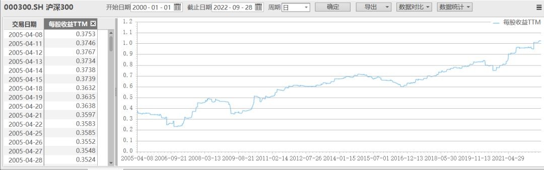 比如沪深300(000300)的每股收益走势如下图: