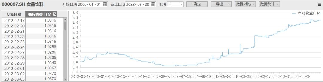 比如食品饮料(000807)的每股收益走势如下图: